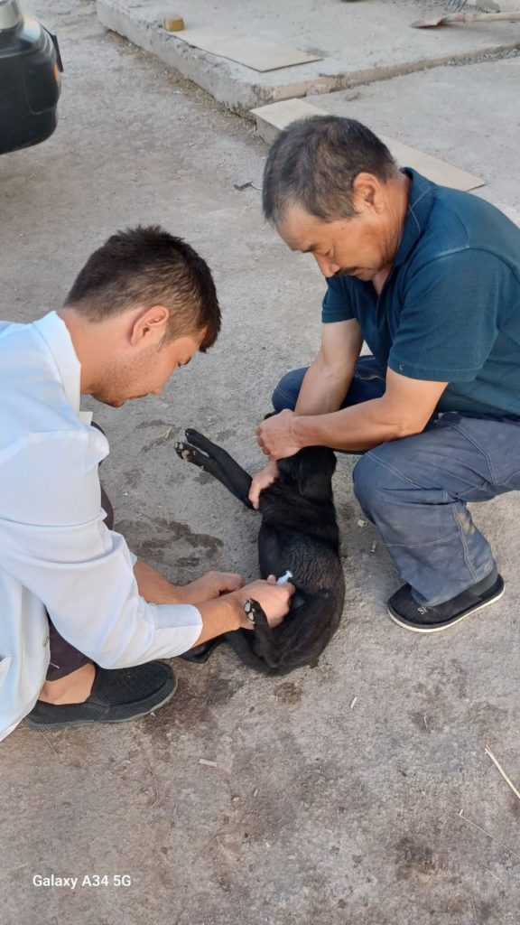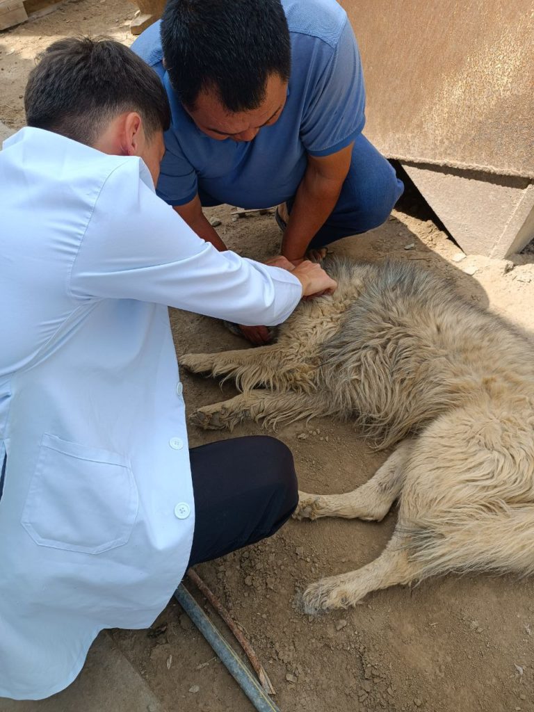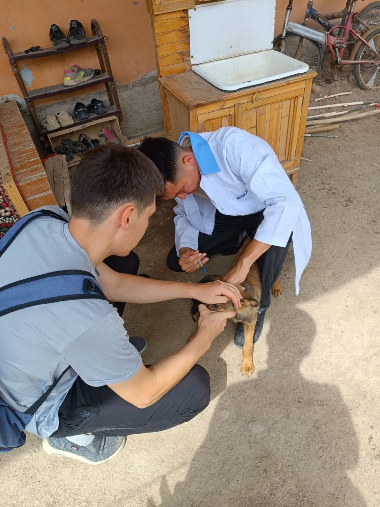 Студентлер участка менгериўшилери Бекбосинов Азамат ҳәм Қарапатов Тенелбай басшылығында хожалықларда бағылып  атырған үй ҳайўанларында профилактикалық емлеў жумысларын алып бармақта.