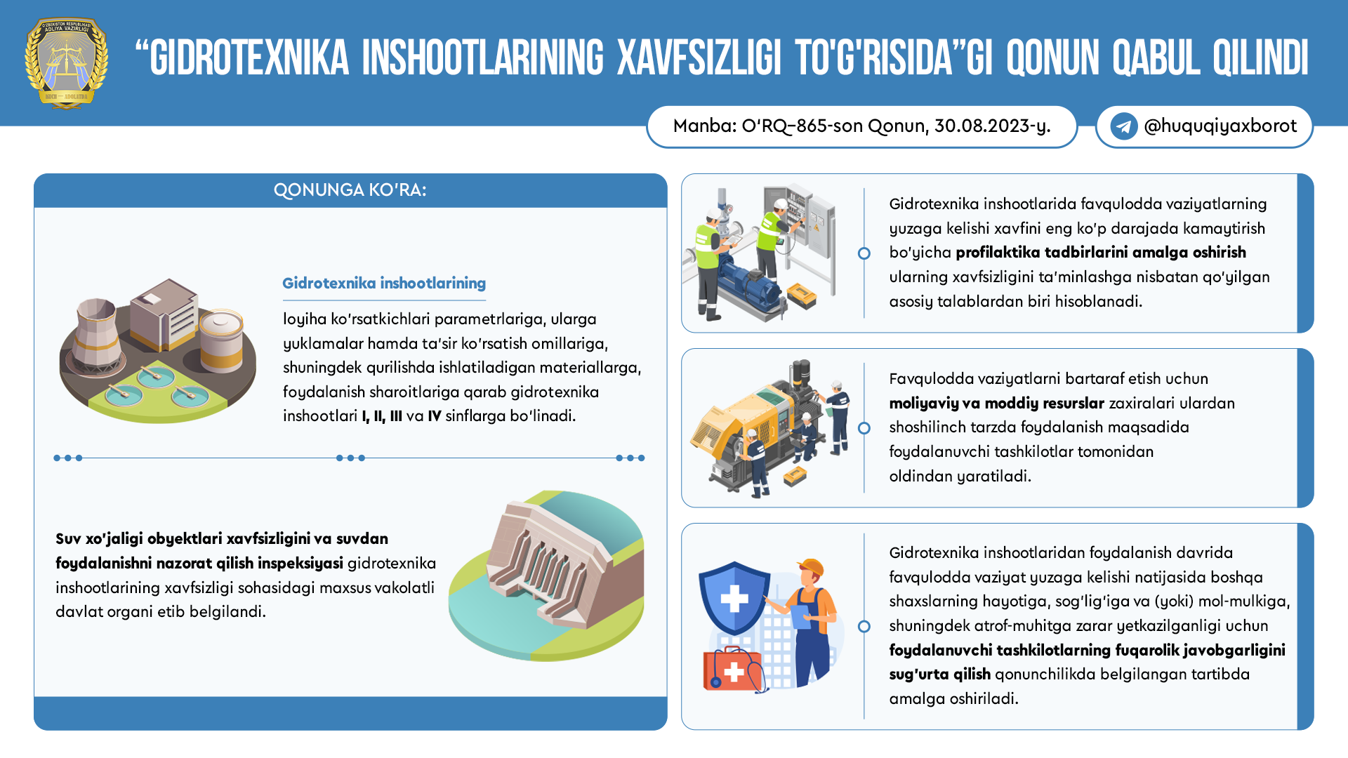 “Gidrotexnika inshootlarining xavfsizligi to‘g‘risida”gi Qonun (O‘RQ–865-son, 30.08.2023-y.) Prezident tomonidan imzolandi.