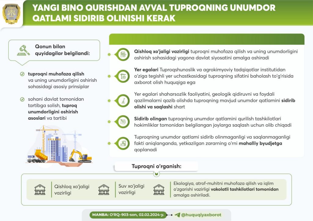 Жер ийелери, қала салыўшы искерлигин, геологик қыдырыўды ҳәм пайдалы қазылмаларды қазып алыўы, соның менен бирге аўыл хожалығына тийисли болмаған басқа искерликти әмелге асырыўда топырақтың әмелдеги өнимли қатламын алып ҳәм сақлаўы шәрт.
